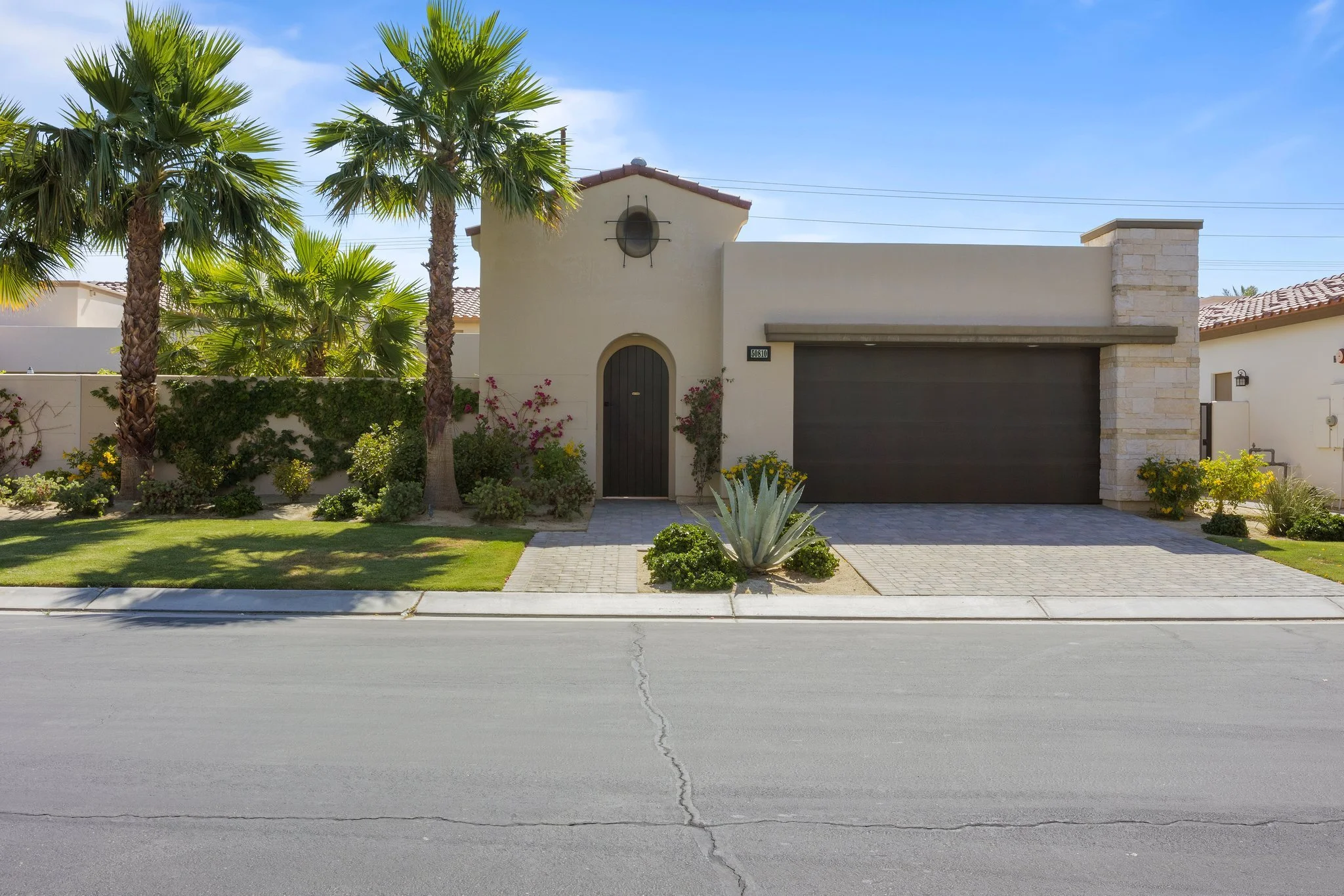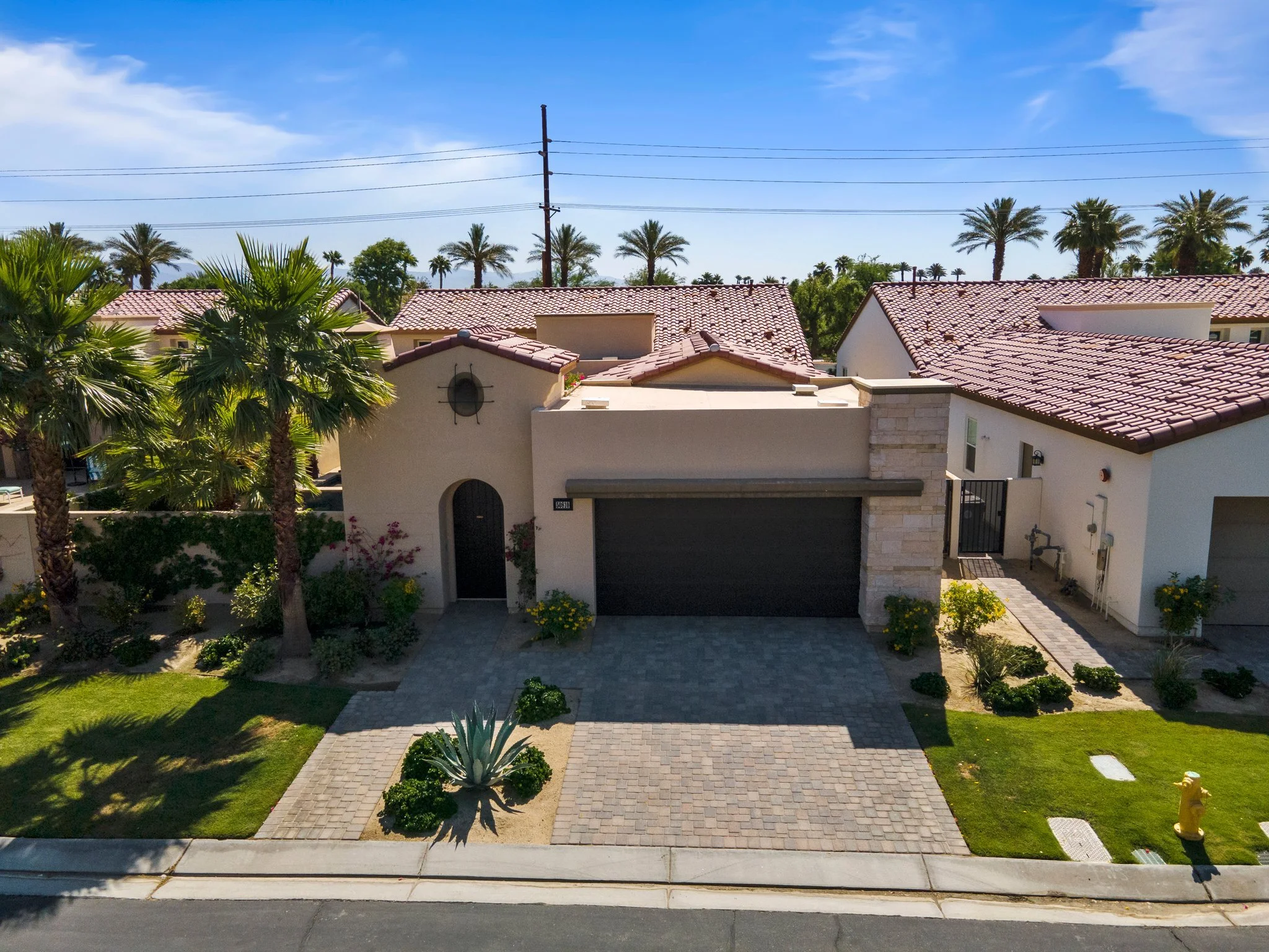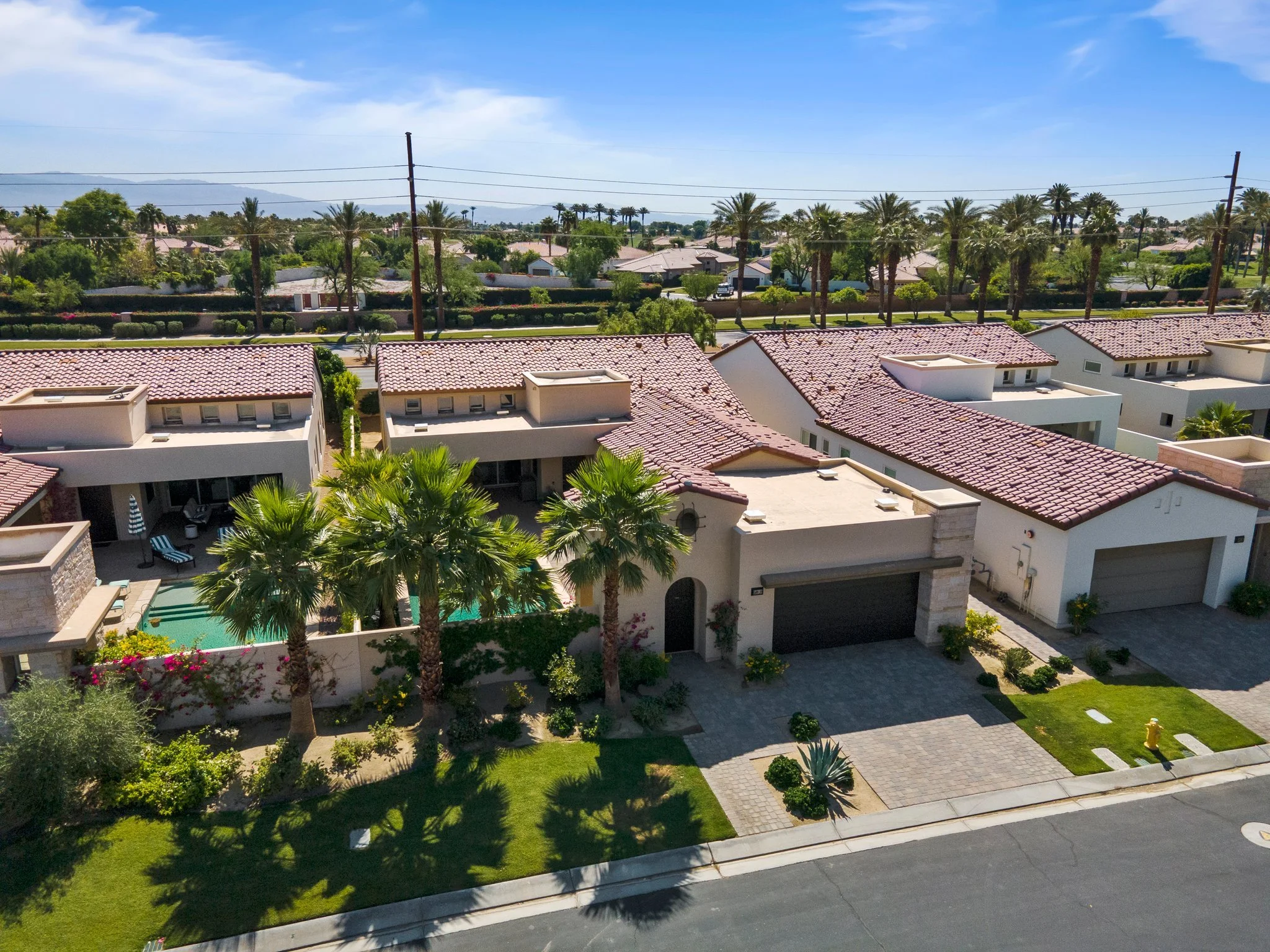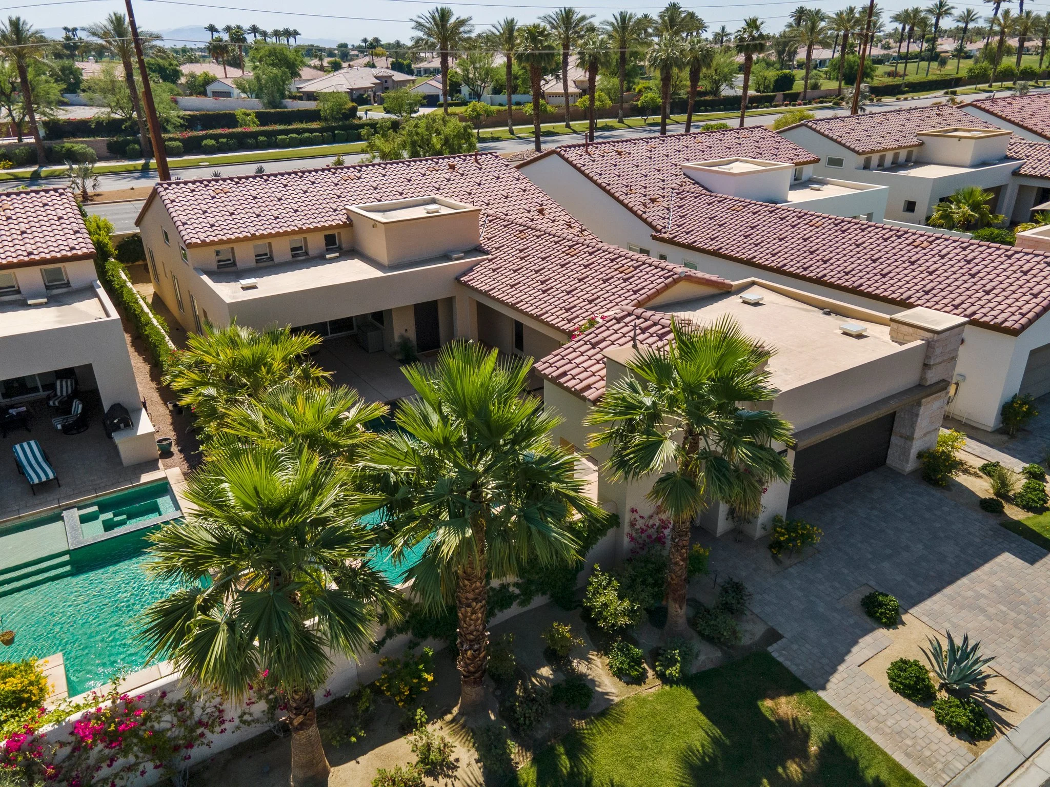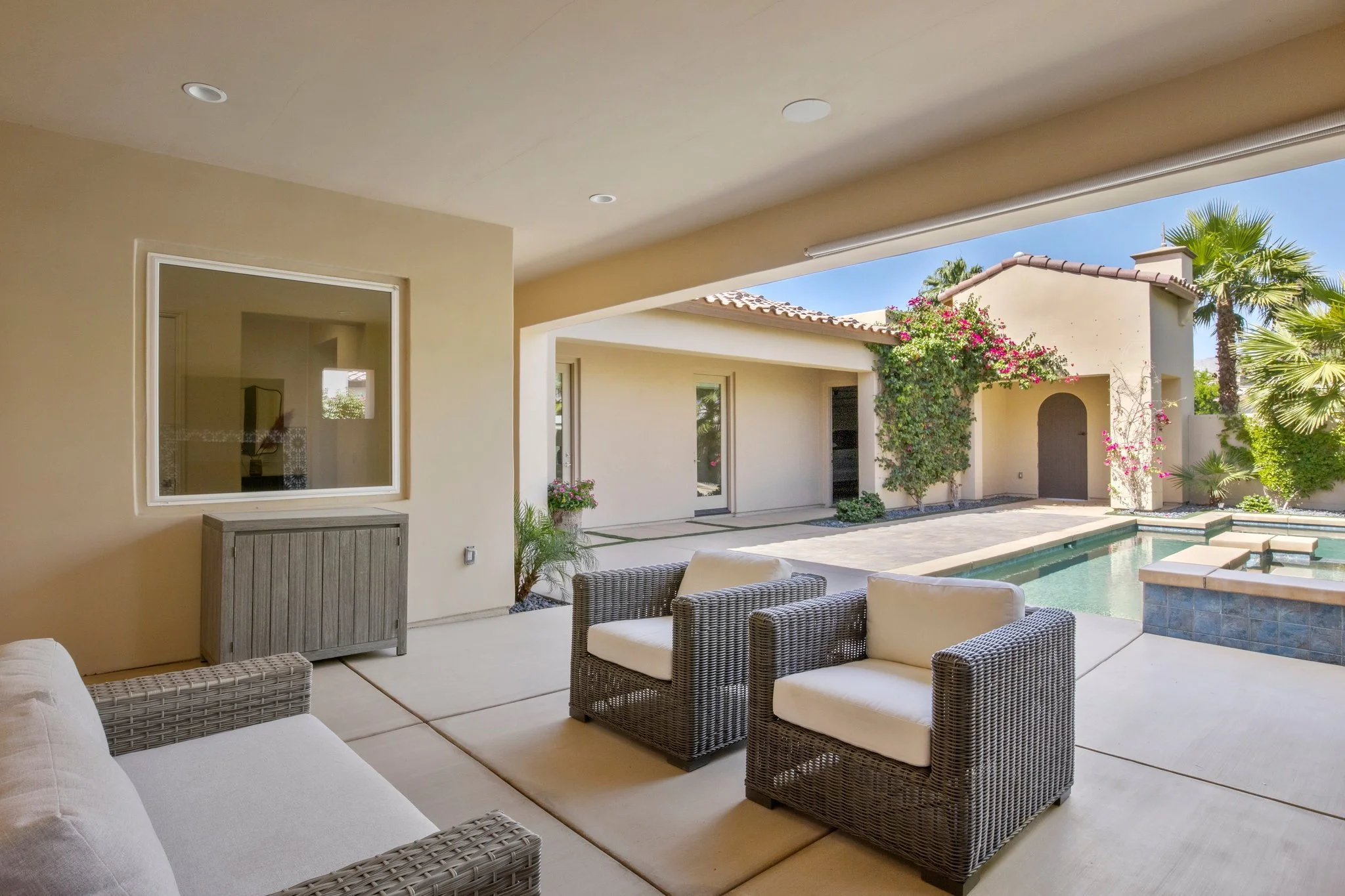 Located in the prestigious Citrus Country Club, this amazing villa offers a luxurious and low-maintenance desert lifestyle. Step inside this newly built home and be greeted by an open floor plan designed to seamlessly blend indoor and outdoor living. The family room features impressive 16'' high ceilings and pocket doors that disappear into the wall, creating a seamless transition to the exterior living room. Enjoy the beautiful desert weather as you entertain guests or simply relax in the comfort of your own home. The chef's kitchen is a true delight, equipped with top-of-the-line stainless steel appliances, an oversized built-in Kitchen-Aid fridge, a large island, and exquisite quartz countertops. Prepare gourmet meals with ease while enjoying the company of your loved ones in the adjacent family and dining areas. The large master suite offers a serene retreat with French doors that open to a secluded patio. Pamper yourself in the master bath, complete with a spacious glass-walled shower and ample closet space. Each of the three bedrooms comes with its own private bath, ensuring privacy and comfort for all. Custom window treatments throughout the home add a touch of elegance and provide privacy when desired. Step outside to your own private oasis. The salt-water pool beckons for a refreshing swim, surrounded by beautiful palm trees that create a tranquil ambiance. Spend leisurely afternoons lounging by the pool or hosting unforgettable gatherings with friends and family. With a two-car garage and additional space for a golf cart, this home offers practicality alongside its luxurious features. Whether you're looking for a vacation home or a permanent residence, this pool villa is ready to fulfill your dreams of desert living.