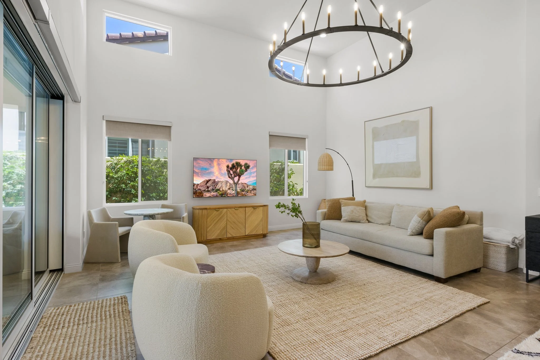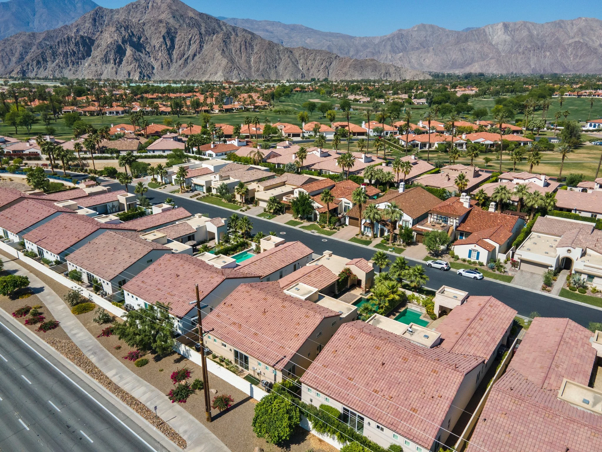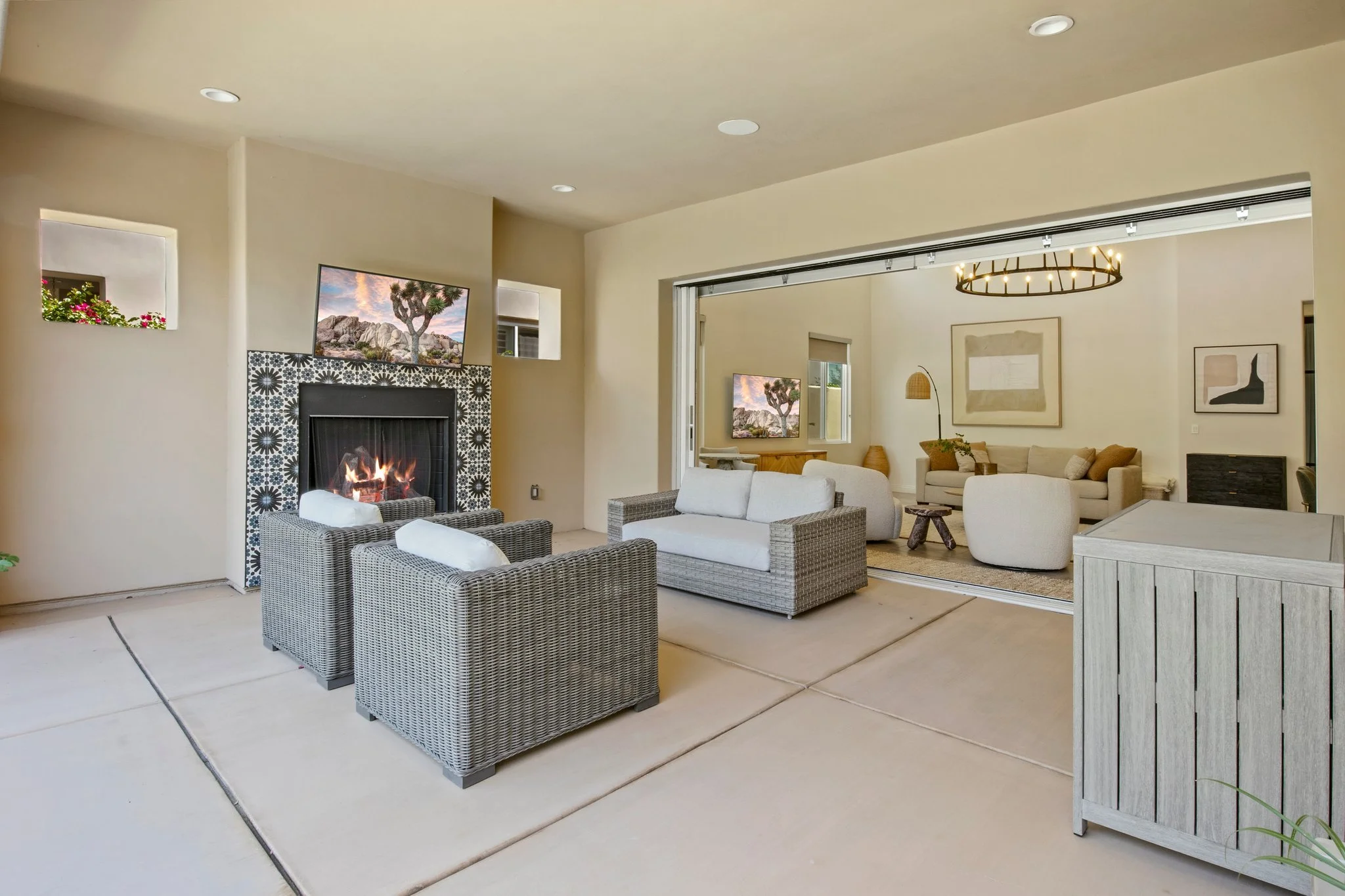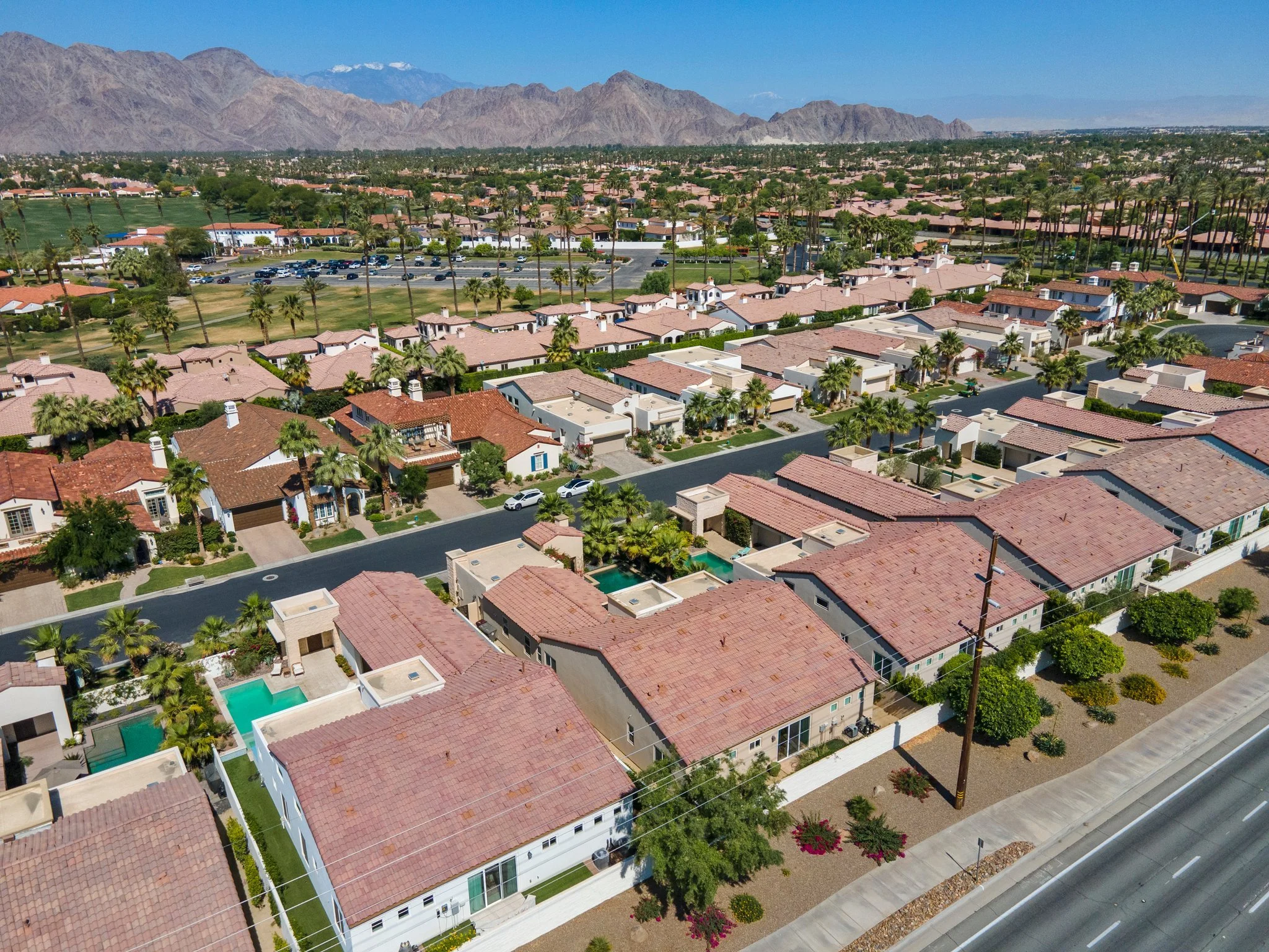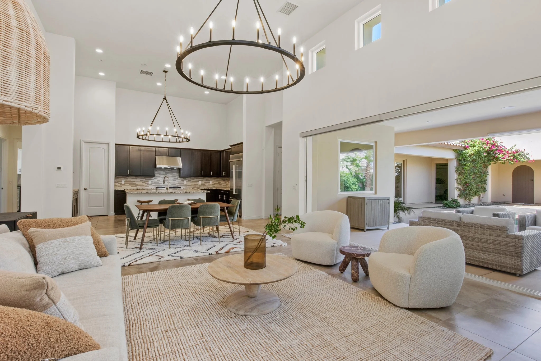 Located in the prestigious Citrus Country Club, this amazing villa offers a luxurious and low-maintenance desert lifestyle. Step inside this newly built home and be greeted by an open floor plan designed to seamlessly blend indoor and outdoor living. The family room features impressive 16'' high ceilings and pocket doors that disappear into the wall, creating a seamless transition to the exterior living room. Enjoy the beautiful desert weather as you entertain guests or simply relax in the comfort of your own home. The chef's kitchen is a true delight, equipped with top-of-the-line stainless steel appliances, an oversized built-in Kitchen-Aid fridge, a large island, and exquisite quartz countertops. Prepare gourmet meals with ease while enjoying the company of your loved ones in the adjacent family and dining areas. The large master suite offers a serene retreat with French doors that open to a secluded patio. Pamper yourself in the master bath, complete with a spacious glass-walled shower and ample closet space. Each of the three bedrooms comes with its own private bath, ensuring privacy and comfort for all. Custom window treatments throughout the home add a touch of elegance and provide privacy when desired. Step outside to your own private oasis. The salt-water pool beckons for a refreshing swim, surrounded by beautiful palm trees that create a tranquil ambiance. Spend leisurely afternoons lounging by the pool or hosting unforgettable gatherings with friends and family. With a two-car garage and additional space for a golf cart, this home offers practicality alongside its luxurious features. Whether you're looking for a vacation home or a permanent residence, this pool villa is ready to fulfill your dreams of desert living.